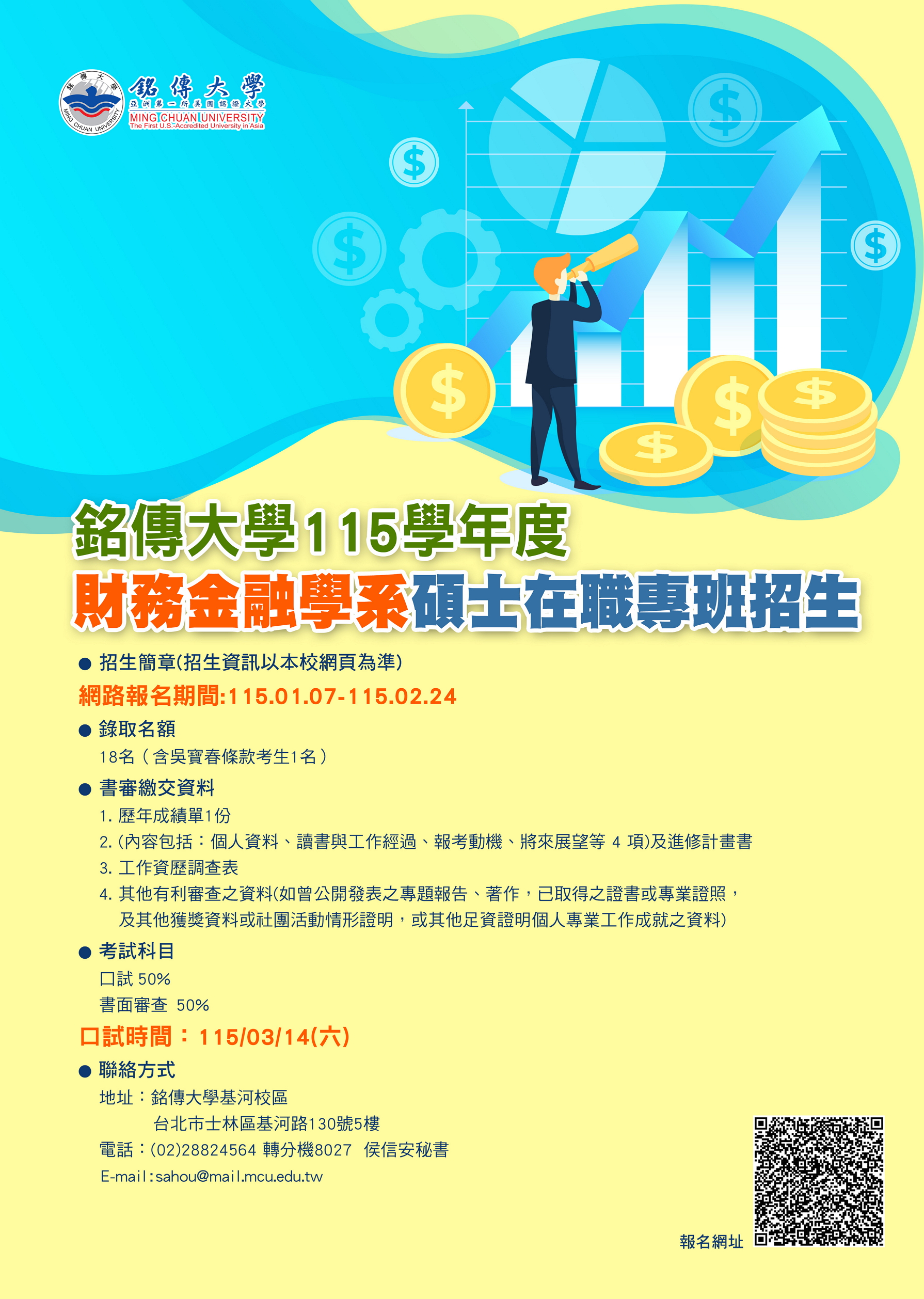 銘傳大學財務金融學系 115 學年度碩士在職專班考試入學招生資訊